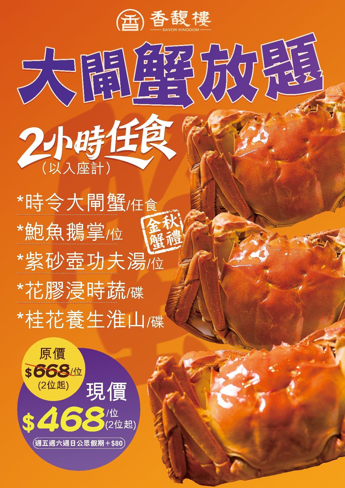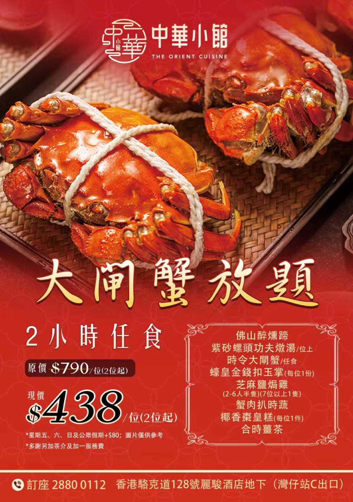 - 優惠必須兩位起使用;另收每位茶芥$15及原價加一服務費$58.8。