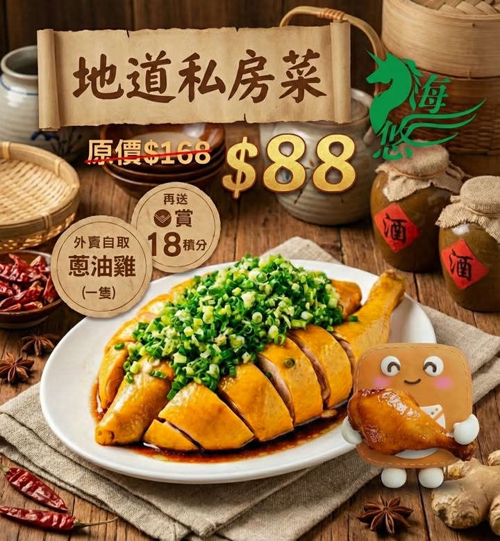 限時$88搶購海悠招牌蔥油雞(一隻)外賣自取禮券包,再送18積分!原價$186,現享半價優惠,立即加入會員領取! 🎁 禮包內容 - 海悠蔥油雞(一隻)外賣自取兌換券 - Storellet賞 18積分 📍 兌換方式 : - 需先成為海悠會員,優惠券將存入「我的錢包」 - 此優惠券只限外賣自取 - 兌換時需出示電子優惠券 📌 使用規則 ✓ 不可與其他優惠、套餐、折扣同時使用 ✓ 優惠券有效期至2026年12月31日 ✗ 不可兌換現金