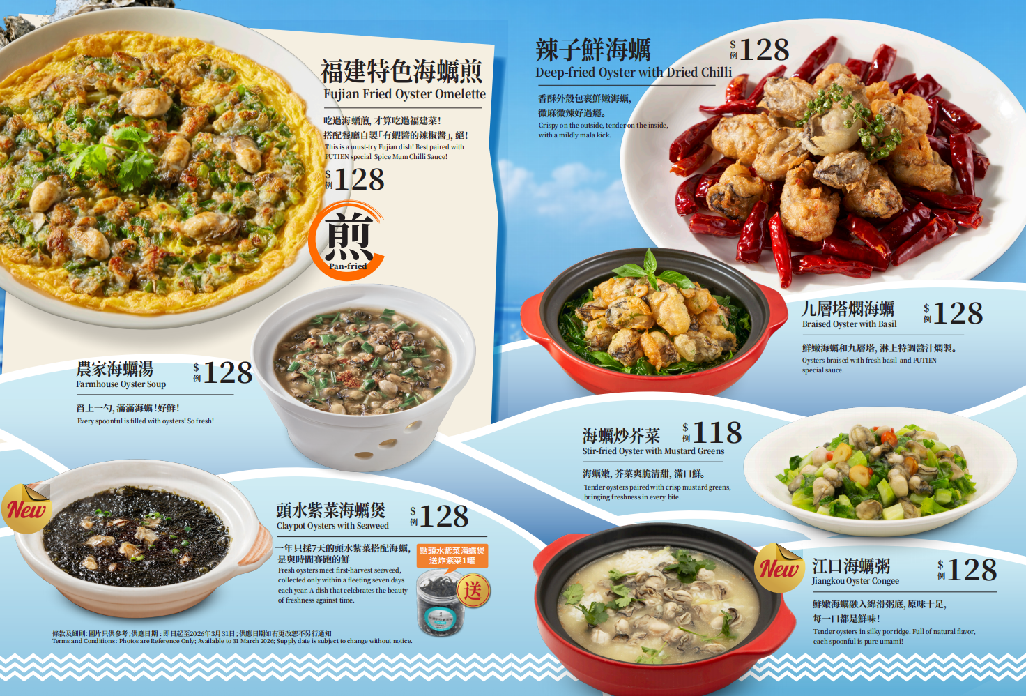 🦪 福建特色海蠣煎:吃過海蠣煎,才算吃過福建菜!搭配餐廳自製「有蝦醬的辣椒醬」,絕! 🦪 辣子鮮海蠣:香酥外殼包裹鮮嫩海蠣,微麻微辣好過癮。 🦪 農家海蠣湯:舀上一勺,滿滿海蠣!好鮮! 🦪 九層塔燜海蠣:鮮嫩海蠣和九層塔,淋上特調醬汁燜製。 🦪 海蠣炒芥菜:海蠣嫩,芥菜爽脆清甜,滿口鮮。 🆕 頭水紫菜海蠣煲:一年只採7天的頭水紫菜搭配海蠣,是與時間賽跑的鮮! 🆕 江口海蠣粥:鮮嫩海蠣融入綿滑粥底,原味十足,每一口都是鮮味!