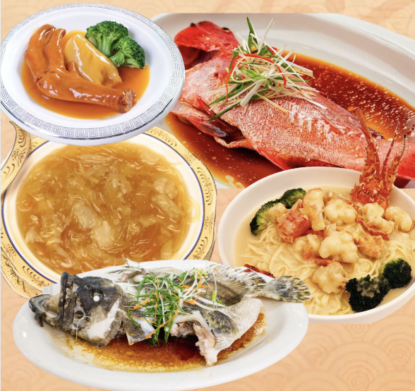 菜單: 五福臨門拼盤 红燒海皇魚翅 珊瑚蚌炒带子 清蒸花尾龍躉 原隻花膠鵝掌 上湯花蝦伊麵 金牌脆皮烧雞 鮑汁海鮮炒飯 黑糖馬拉糕