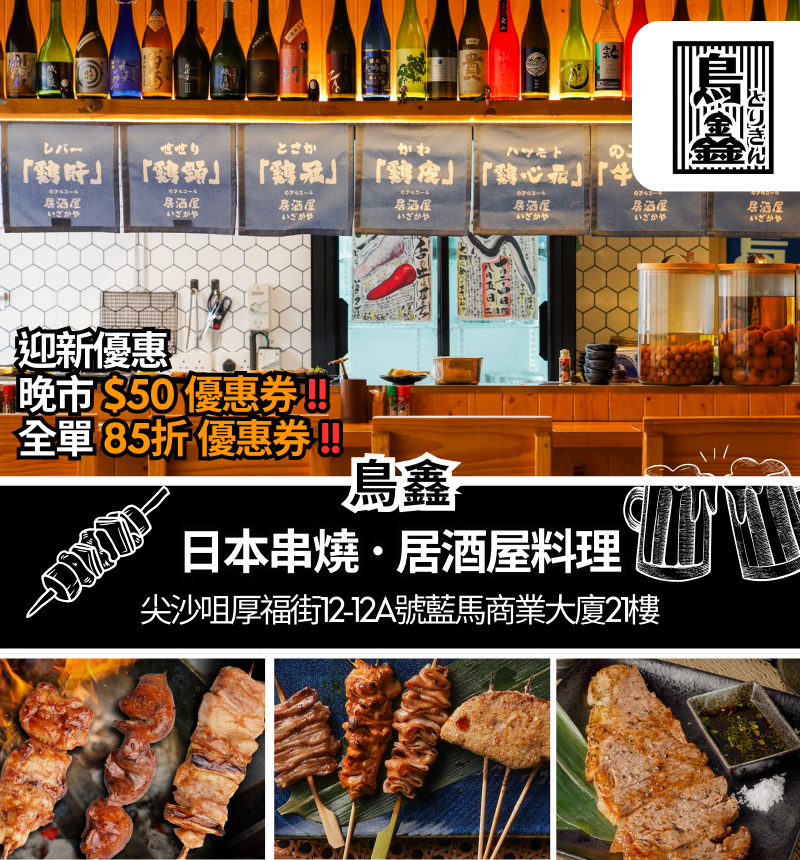 鳥鑫係一間位於尖沙咀嘅日式串燒餐廳,以簡約樸素嘅木質風格設計,打造出溫馨宜人嘅氛圍。餐廳嘅菜單提供超過20種唔同嘅燒烤選擇,由傳統口味到創新嘅選擇,包括和牛、海鮮同蔬菜串燒。