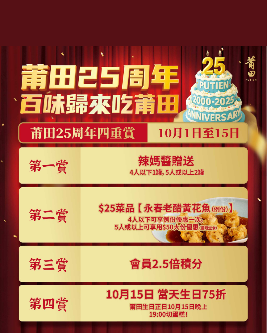 莆田,一家源自新加坡的福建菜餐廳,連續七年榮獲新加坡米芝蓮一星餐廳。 2025年10月,莆田迎來了成立25週年的華麗時刻🎉 為感謝大家多年以來的支持,特別推出「四重賞」限定活動,讓大家在品嚐經典美味時,盡享滿滿福利🎁