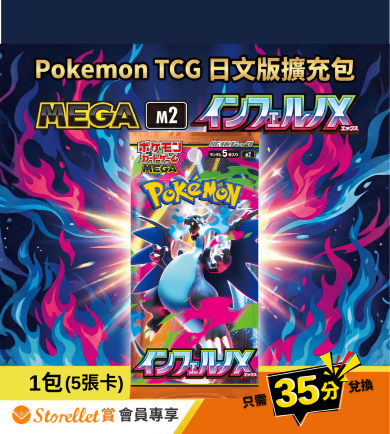 🔥即日起可於Storellet賞兌換《Pokémon MEGA M2 Inferno X》日文版擴充包 1包(內含5張卡) ⚡收藏對戰都超值💥 ⚡ 名額有限,先到先得,快啲登入Storellet賞嚟換走佢啦!