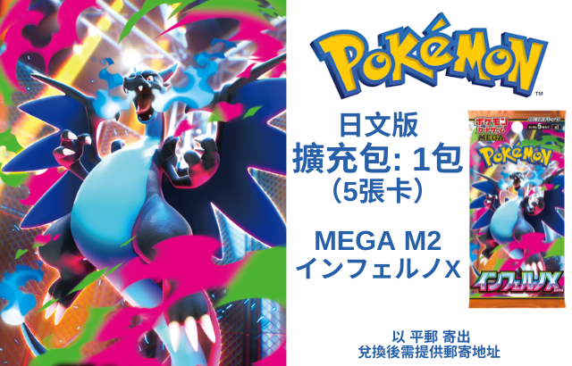 🎁 每次成功兌換可獲 《Pokémon MEGA M2 Inferno X》日文版擴充包 1包(內含5張卡)
