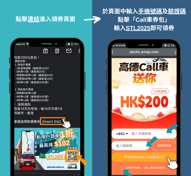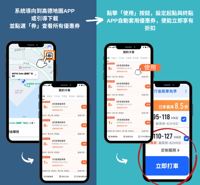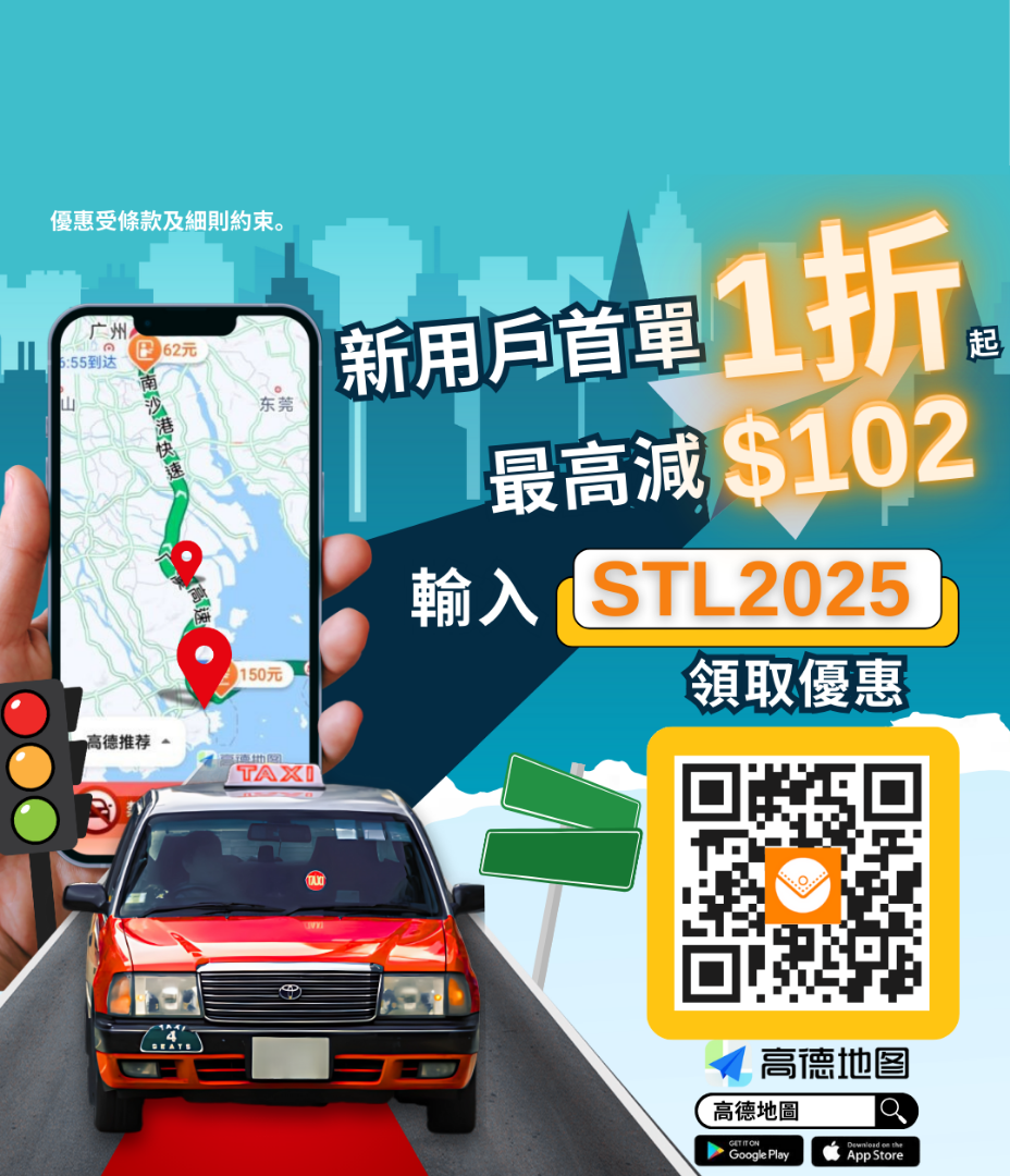 輸入優惠碼【STL2025】立即領取高德打車券! 新用戶享1折首單優惠(最高減102元),現有用戶領200元券包! 優惠券14天內有效,全港適用!