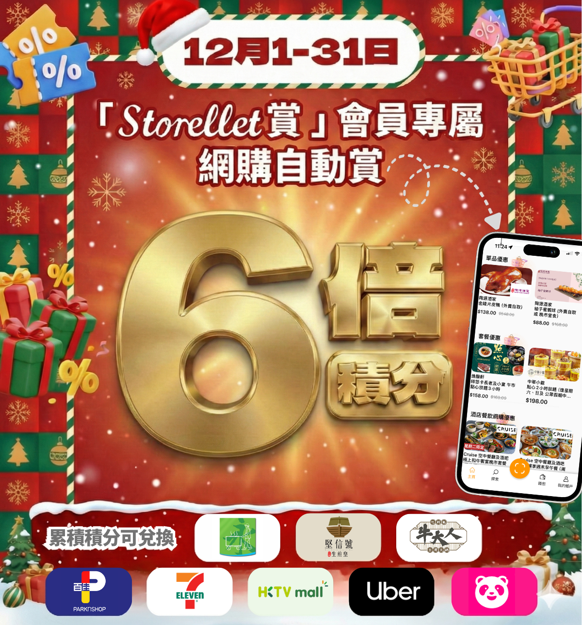 即日起至2025年12月31日,「Storellet賞」會員於任何餐廳的【超值網購優惠】消費,單次滿$100,即自動額外獲 6分「Storellet賞」積分! 滿 $200 獲 12分,$300 獲 18分,積分將按比例累積。 🎁 累積積分可兌換便利店、Uber、超市、外賣平台及餐廳現金券等獎賞。 💡「Storellet賞」是由 Storellet 推出的獎賞計劃。 只需於 Storellet App 內搜尋「Storellet賞」並加入成為會員 ➡️📱 即可開始累積積分,並兌換各類心儀禮品。
