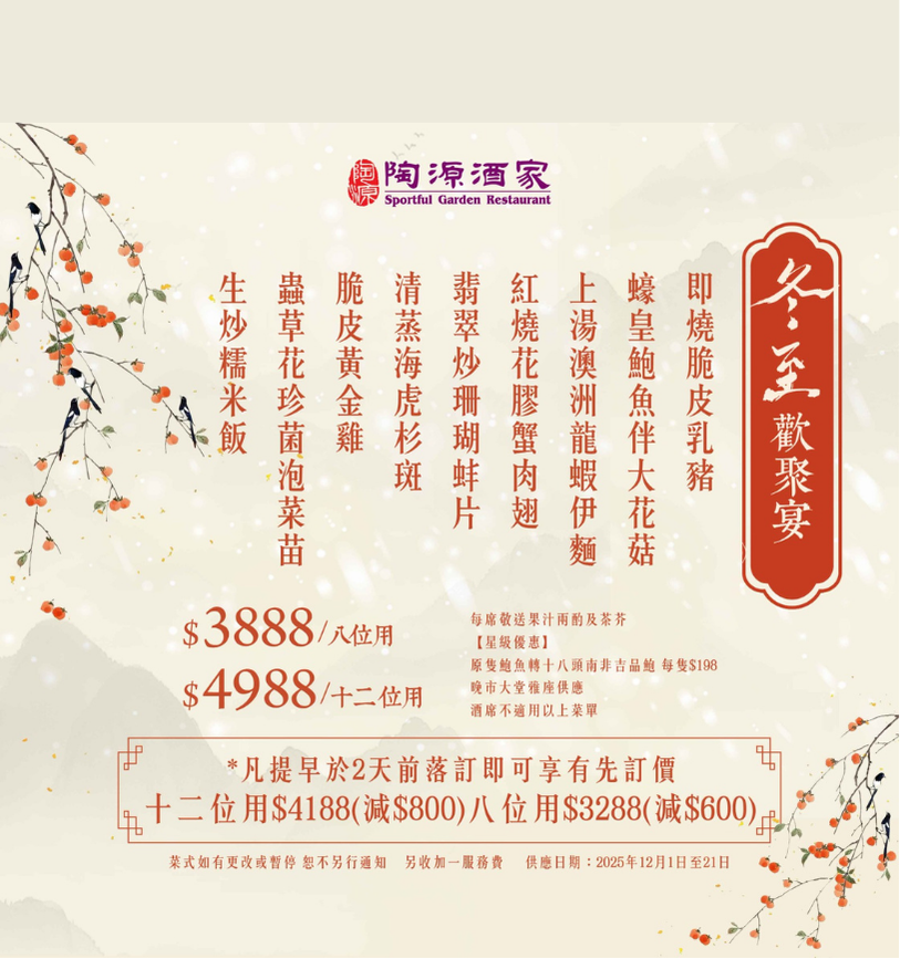 【陶源酒家|冬至歡聚宴 · 先訂享即減高達$800】🥂