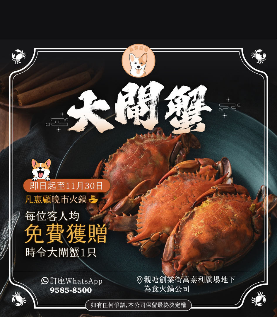 【為食火鍋|限時優惠 · 惠顧晚市火鍋即送大閘蟹】🦀