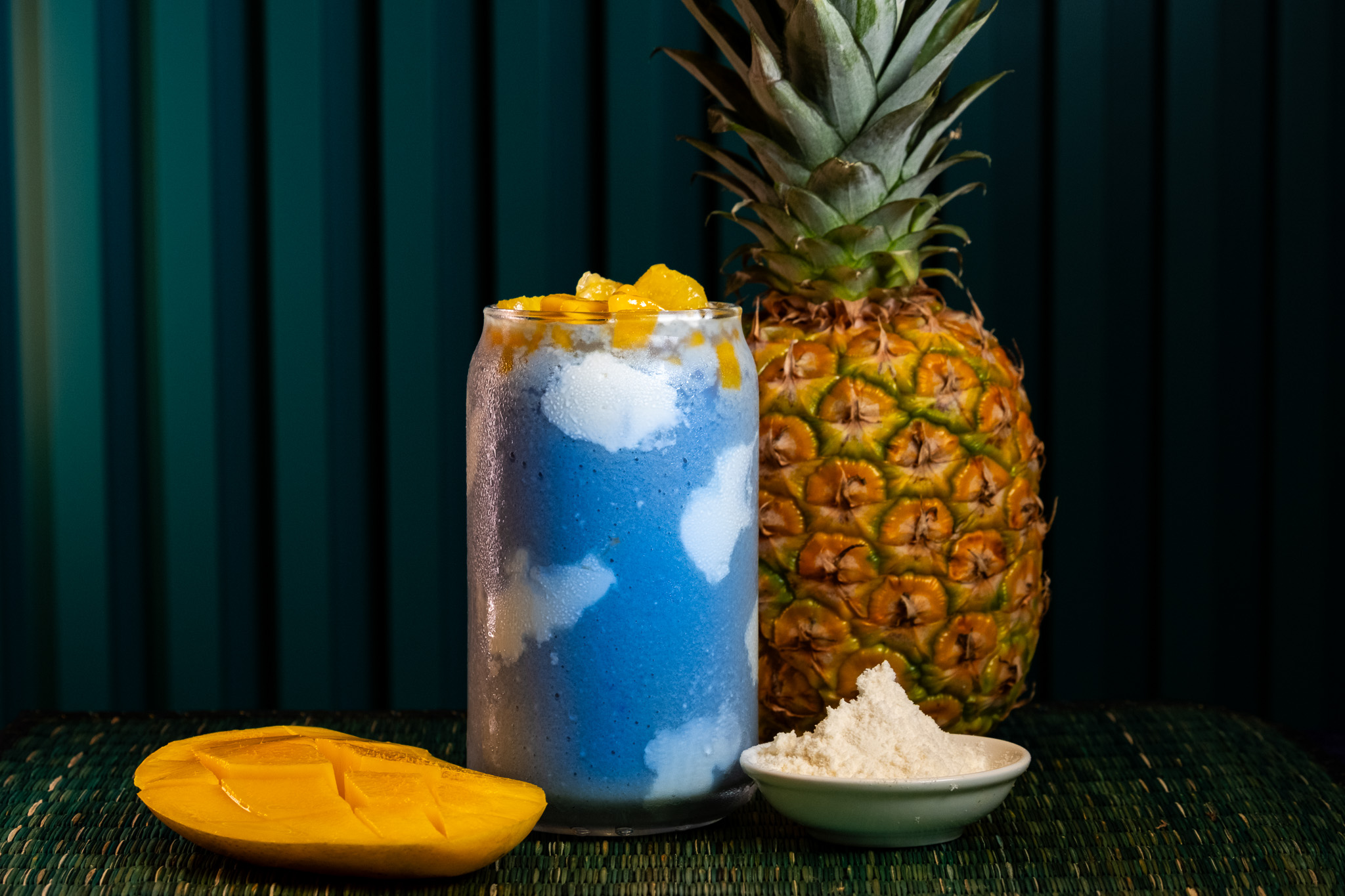 以新鮮芒果的香甜、菠蘿的清爽為基底,加入全脂奶與椰奶調和出絲滑順口的質地,再融入螺旋藻帶來的獨特藍綠色澤與營養,搭配蛋白粉提升飽腹感,既有水果的清爽,又有蛋白質的充實感,藍綠色的外觀宛如夏日晴空與白雲,視覺與味蕾體驗同樣療癒。