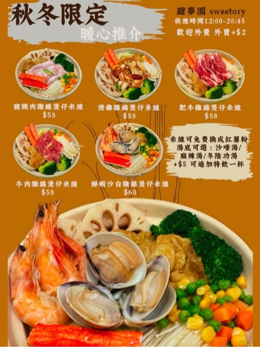 甜夢園提供多款台式甜品、港式糖水,如鮮奶綿花冰、芒椰系列飲品,還有各式主食、燉湯與地道小食😄
