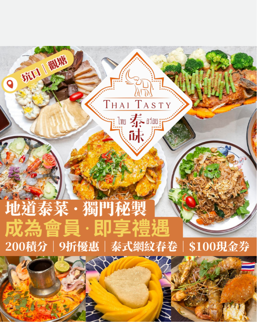 (1)200積分 (2)全單9折優惠 (3)免費泰式網紋春卷(一份) (4)$50現金券(2張) 優惠收條款及細則約束。 優惠可能隨時更改或取消,敬請留意。