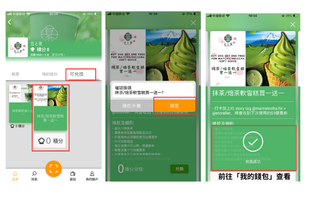 如何搶券? (1)進入「豆と茶」頁面的「可兌換」頁面 (2)選擇 0 積分兌換的【抹茶鮮奶買一送一】,【抹茶/焙茶軟雪糕買一送一】優惠券 (3)確認兌換 【抹茶鮮奶買一送一】,【抹茶/焙茶軟雪糕買一送一】優惠券 (4)成功兌換,前往「我的錢包」查看優惠券