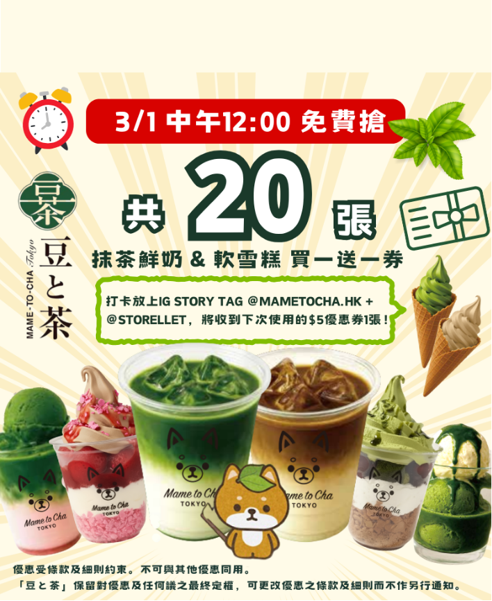 感謝大家一直以來的支持! 豆と茶 1月3日中午12點,搶券活动开始啦!大家準備好開搶未?! • 抹茶鮮奶買一送一(10張) • 抹茶/焙茶軟雪糕買一送一(10張) * 優惠受條款及細則約束;優惠可能隨時更改或取消,敬請留意。