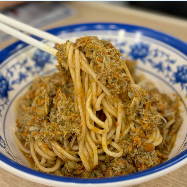 蟹黃拌麵太誘人!滿勺蟹黃拌勻後,麵條掛滿鮮香膏油,嗦一口滿嘴蟹鮮😄