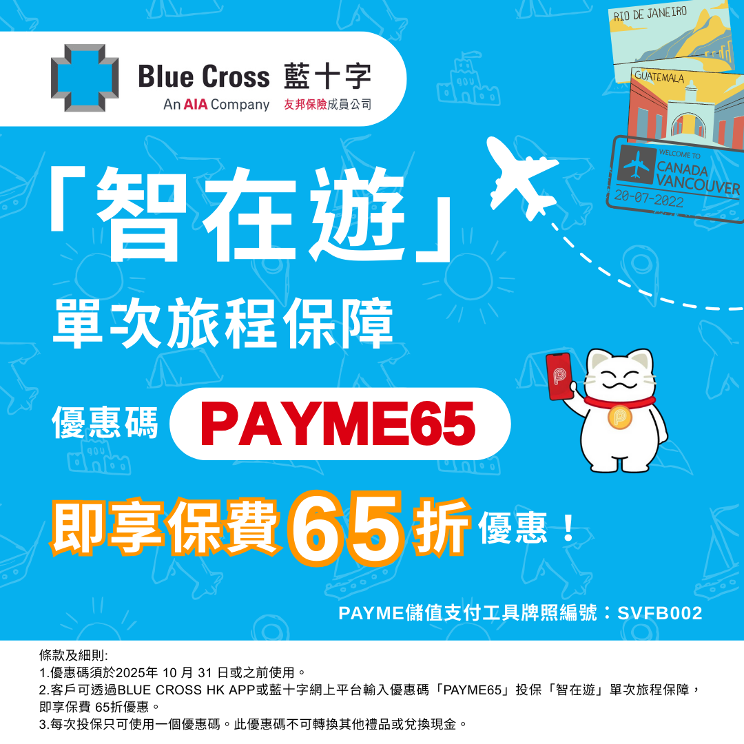 2. 客戶可透過Blue Cross HK App或藍十字網上平台輸入優惠碼「PAYME65」投保「智在遊」單次旅程保障,即享保費 65折優惠。