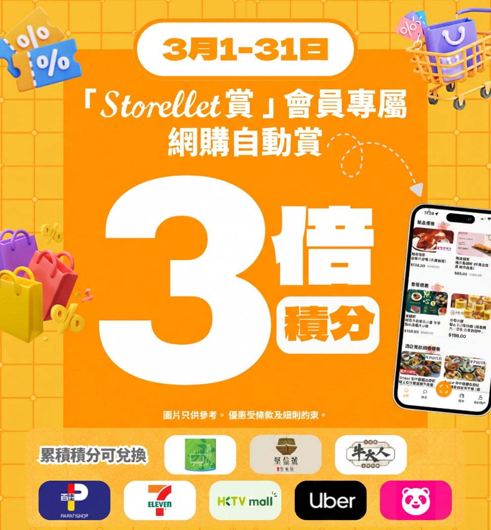 即日起至2026年3月31日,「Storellet賞」會員於任何餐廳的【超值網購優惠】消費,單次滿$100,即自動額外獲 3分「Storellet賞」積分! 滿 $200 獲 6分,$300 獲 9分,積分將按比例累積。 🎁 累積積分可兌換便利店、Uber、超市、外賣平台及餐廳現金券等獎賞。 💡「Storellet賞」是由 Storellet 推出的獎賞計劃。 只需於 Storellet App 內搜尋「Storellet賞」並加入成為會員 ➡️📱 即可開始累積積分,並兌換各類心儀禮品。