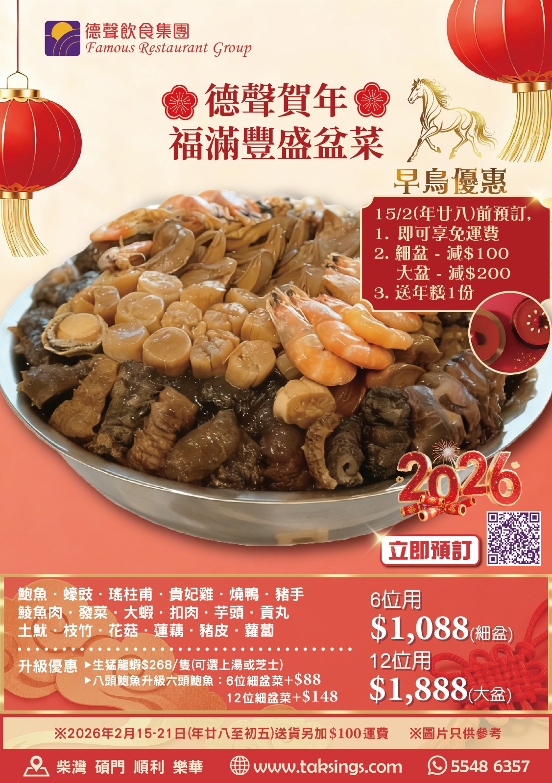 🤩德聲盆菜・家味常在 🔥豐富足料,絕對係你嘅最佳選擇!💰 🌟早鳥優惠🌟2026年2月15日(年廿八)前預訂: 1)即可享免運費 2)細盆減$100,大盆減$200 3)送年糕1份