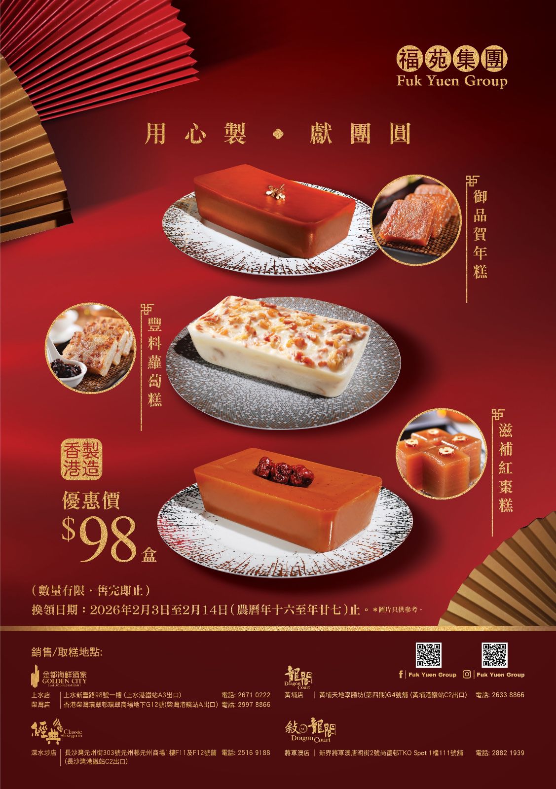 條款及細則: • 提貨券有效期為2026年2月3日﹣2月14日 • 此提貨券不可兌換現金、退款或作現金找續 • 福苑集團保留對此優惠券使用的最終決定權
