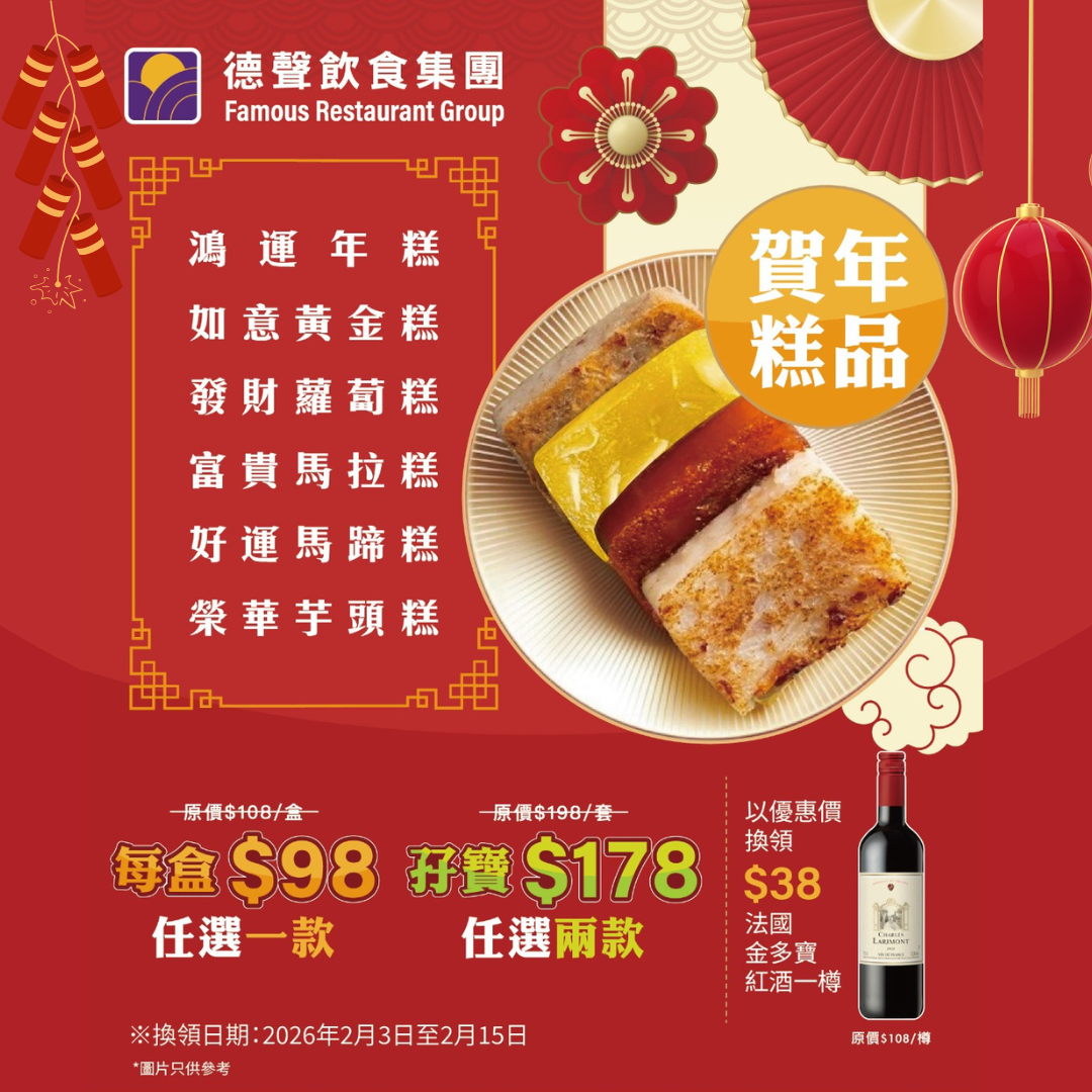 🤩德聲點心・手作傳心 🔥賀年糕品,絕對係你送禮自用嘅最佳選擇!💰 優惠價尊享: - $98 (任選一款) (原價$108/盒) - $178 (任選兩款) (原價$198/套) 🤩升級優惠 +$38換領法國金多寶紅酒一樽(原價$108/樽) ※換領日期:2026年2月3日至2月15日
