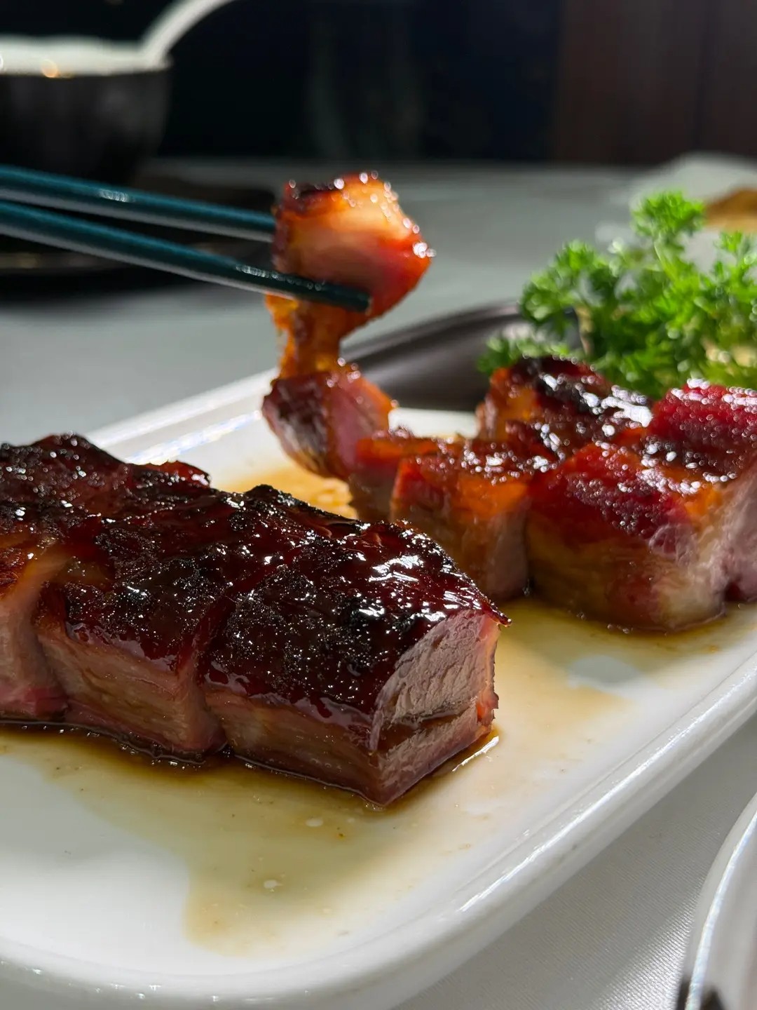 選用肥瘦相間的優質梅花肉,炙烤時刷上層層濃稠蜜汁,火候細控至外皮微焦起脆,咬開卻是厚切肉質的軟嫩多汁 ,入口先嘗到蜜汁的焦香回甜,每一块都帶著古法工藝的醇厚,是粵式燒味裡的經典風味。