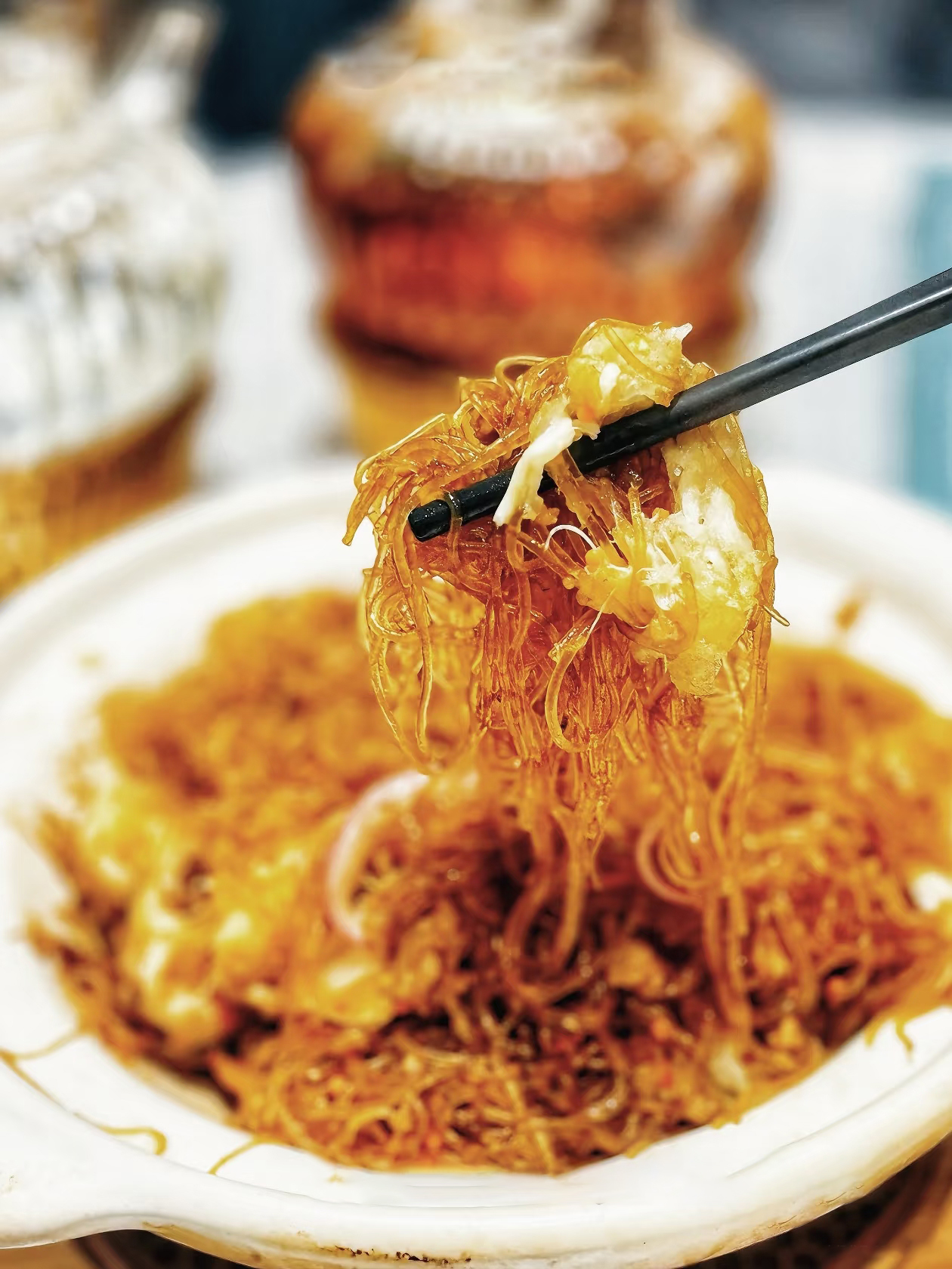 選用新鮮蟹拆出飽滿蟹肉,搭配吸味力強的細滑粉絲,以「乾逼」手法鎖住鮮香,直至湯汁幾乎收乾,鍋底微帶焦香。 出鍋時蟹肉纖細分明,裹著晶瑩飽滿的粉絲,入口先是蟹肉的鮮勁衝擊味蕾,而後粉絲的軟滑與底味的鹹鮮纏繞,每一口都鮮得夠味,毫無多餘水分,盡顯「乾逼」菜式的濃香惹味。