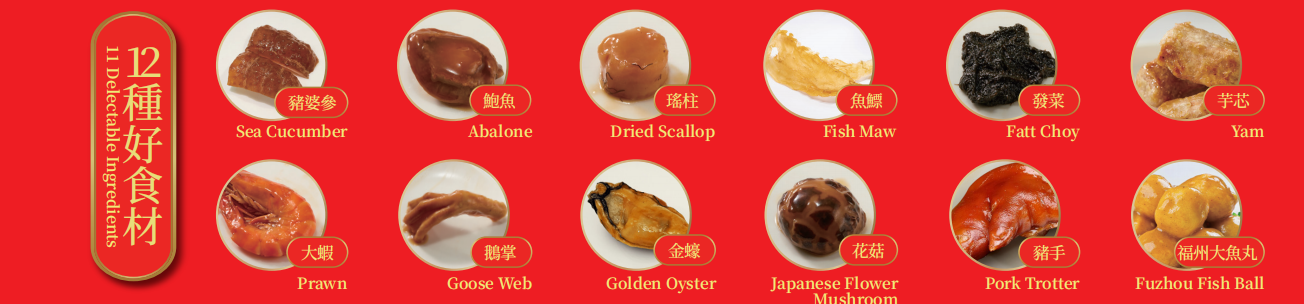 ▲嚴選十二種上乘食材,分別以煎、炸、燒、煮、燜、滷等方式悉心烹調,再層層疊入盆中。 葷素巧妙搭配,讓各類食材的風味彼此交融、滲透,匯聚百味於一爐,最終呈現和諧而餘韻悠長的豐美滋味。